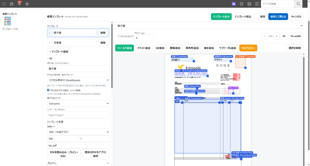 見積書・請求書・納品書などの「既存フォーマット」をそのまま活用。 テンプレはドラッグ&ドロップで編集、QR・画像・明細(サブテーブル)にも対応